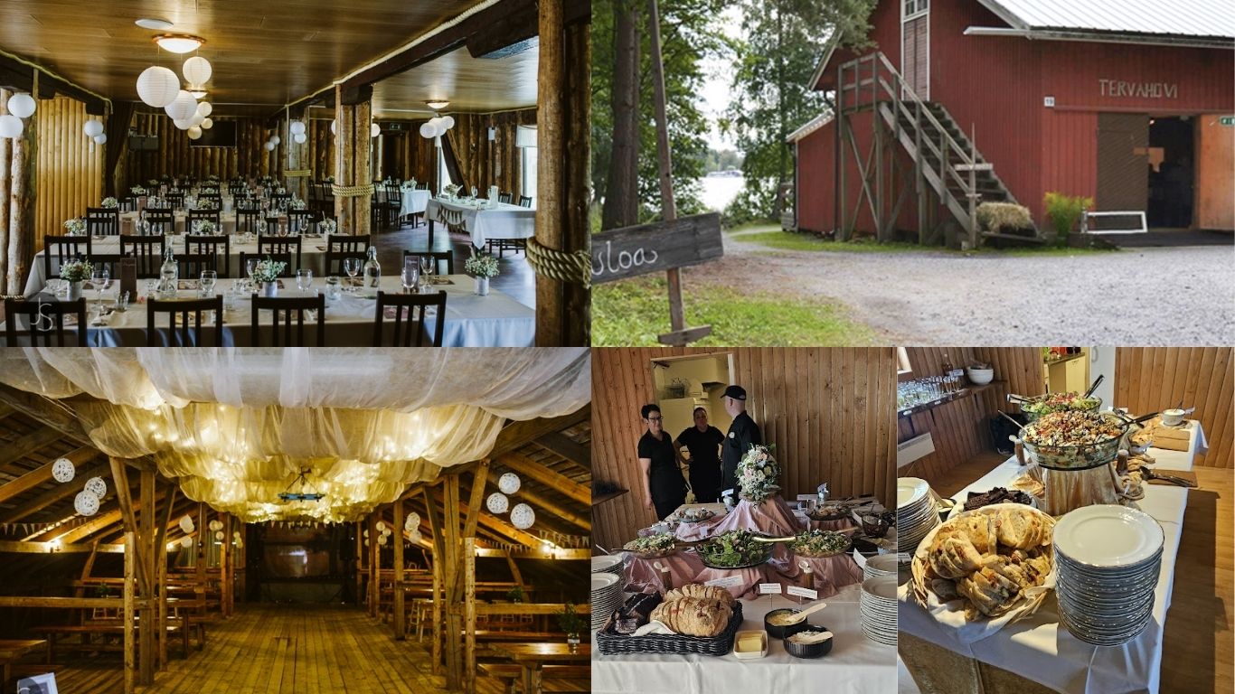 Tervahovi ja Tiilihovi ovat naapureita. Tervahovi on aivan Rautaveden rannalla ja tilaa löytyy sadalle hengelle. Iso plussa on samassa rakennuksessa sijaitseva majoitustila! Usein on pareja vihitty Tervahovin laiturilla.